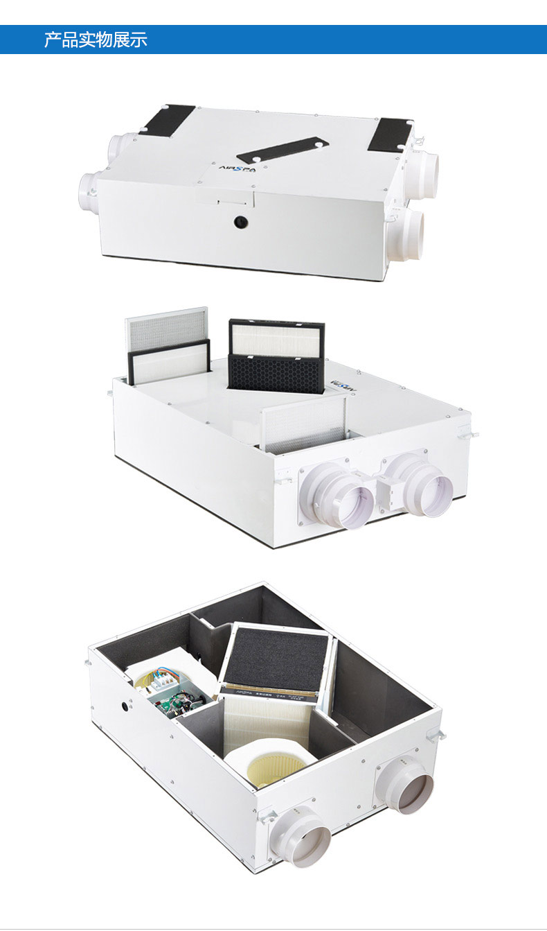 4、雙向流新風機:主機采用雙核動力設計,動力更強,體積更小